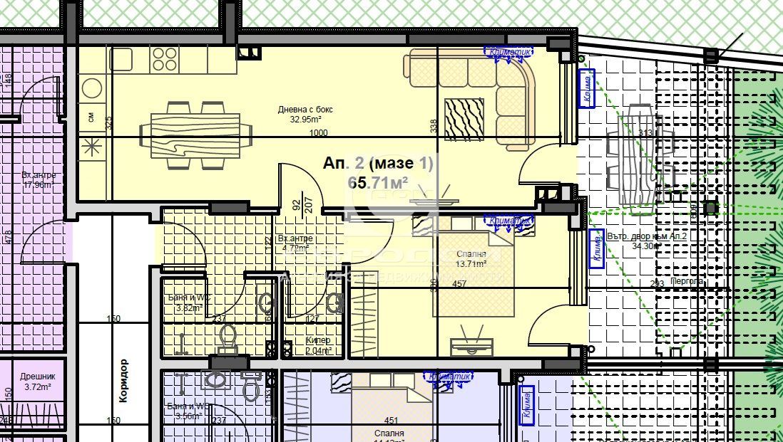 - Чиста жилищна площ: 65.71 кв.м.;